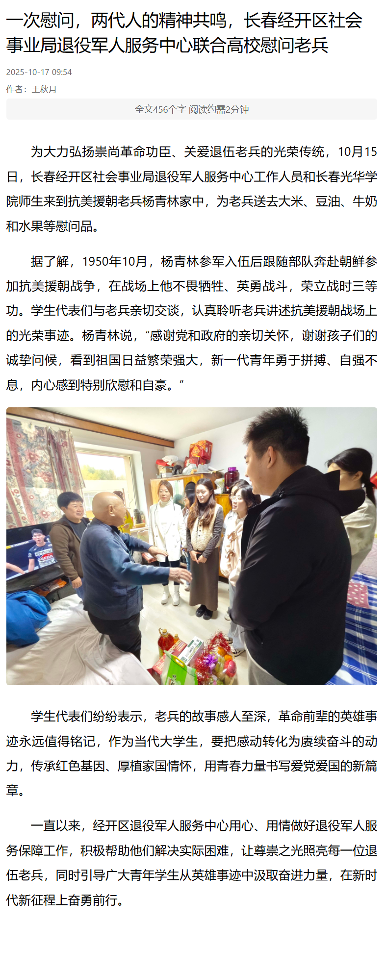 10月17日《彩练新闻》:一次慰问,两代人的精神共鸣,长春经开区社会事业局退役军人服务中心联合高校慰问老兵