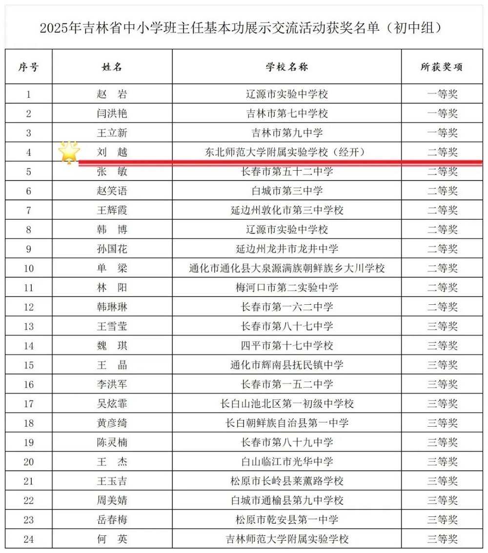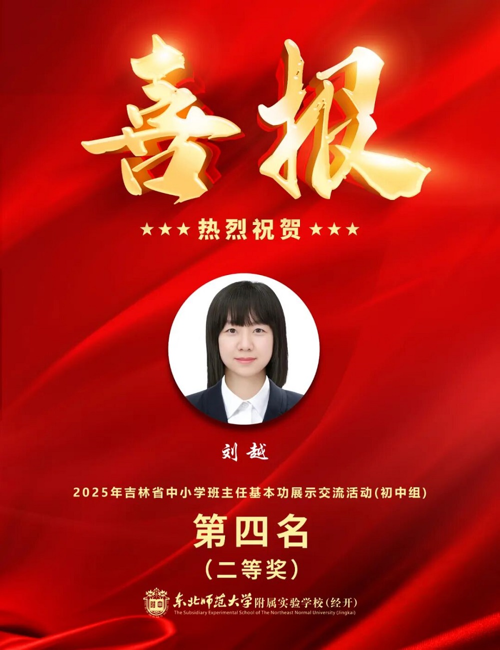 热烈祝贺东北师范大学附属实验学校(经开)刘越老师在从区级、市级再到省级班主任系列赛事中,以过硬的专业能力与真挚的育人初心,突破重重关卡,最终站上省级领奖台,为区争光!